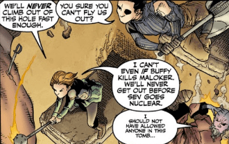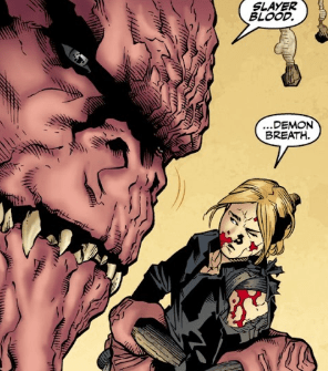As if in deliberate answer to her statement, Buffy suddenly screams in pain as Maloker breaks through the caskets above and grabs her in his claws. “Ow!” Buffy winces as she rechecks her shoulder. “Kay, it’s worse.”