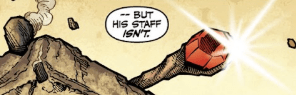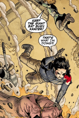 She smiles and moves quickly, racing towards the staff, perched precariously on a ledge above her. She yells at Xander to cover her. “Keep the giant bat busy, Xander!”