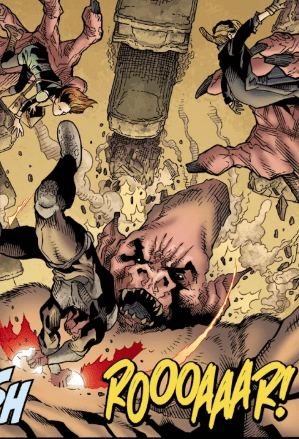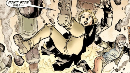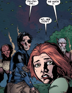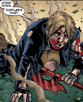 Finally, Buffy’s head, bloodied and bruised, dirty and greasy, but alive, pops over the threshold of the hole. “Stand down,” she says happily and pulls herself up the rest of the way. “Doffler’s dust,” she says and then looks around at the damage. “Was that..?”