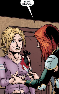 She gently approaches Buffy, a small letter opener in her hand. She holds Buffy’s hands gently and slices a tiny cut in her palm.
