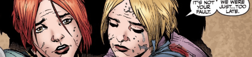 Buffy lowers her head, sadly and then puts her arm around Willow. She looks up at Xander and the others, and whispers quietly, consoling her friend. “It’s not your fault. We were just… too late.”