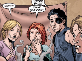 Buffy’s mouth opens in shock, but is soon a huge grin. “Dawn!” Xander looks dumb-founded, unable to quite believe what he’s seeing. “You’re back!”