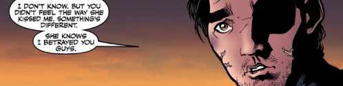 He looks at her. “I don’t know. But you didn’t feel the way she kissed me. Something’s different. She knows I betrayed you guys.” He pulls away, turning his back on his friend.