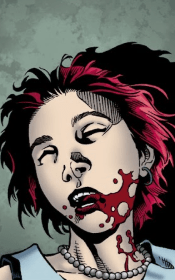 The woman, a redhead with short, striking hair, suddenly awakens. Her eyes are red. Her mouth is smothered with dry blood. She feels for her face, notices the fangs and shrieks in horror. She startles to her feet and spins around, noticing the zompires around her. “What? Where am I?”