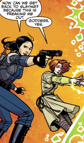 “Look at us all mature.” Kennedy says, reloading her pistol with more silver bullets. “Now, can we get back to the Slaying? Because this is freaking me out.” Willow conjures another bolt of flame from thin air. “Goddess, yes.”