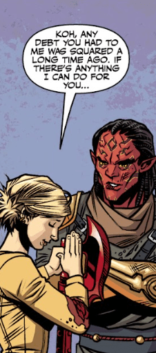 Buffy explains how she met Koh, looking at the warrior with respect. “His name’s Eldre Koh. We’ve butted heads a few times, but if not for him, we’d all have died in the Deeper Well.”
