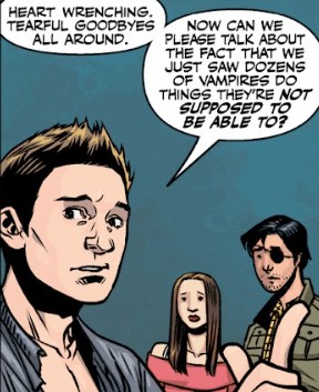 “Not serious at all,” Buffy says, turning to face him outside Dowling’s front door. “About ten minutes after we agreed to call our patrol a date, I disappeared and he almost got torn to pieces. But that’s not the point. He’s a friend. A comrade in arms. A fellow human being. He almost died, fighting at my side, and I forgot.”