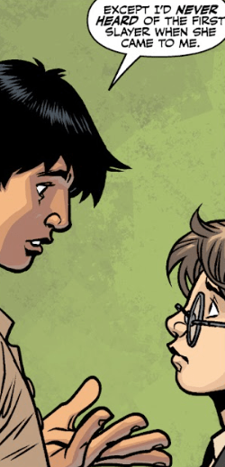 Andrew, upon seeing Billy, overexcitedly, points at Billy and raises his voice. “Okay, wait. Sudden inspiration. Earth has new magic, right? Maybe that means new rules? The Nosferati aren’t the only ones doing stuff they shouldn’t. Billy had a spirit vision of the First Slayer, right about the time they kick-started the new Seed.”