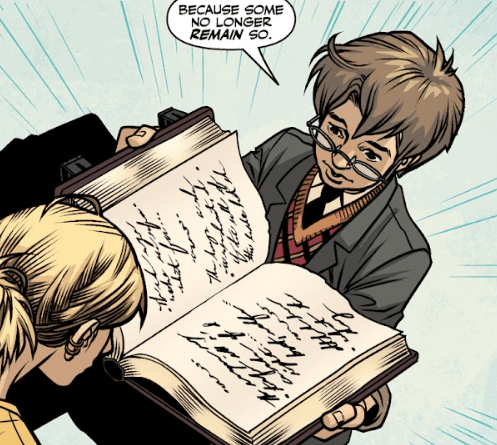 “How odd,” Giles says, not looking at her, but down into the book. He opens it wide, so Buffy can see the open pages. “Because some no longer remain so.”