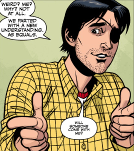 “Weird? Me? Why? Not at all,” he says, goofy grin hiding his nerves. “We parted with a new understanding as equals.” Then he looks down, quietly and asks if someone could go with him?