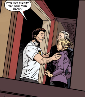 No one answers Buffy’s question, but Andrew looks at her sheepishly. Dawn has bounded towards the teenage Giles, and has squeezed him in a tight hug. Xander ruffles the young boy’s head with a large grin on his face. “And quite an adorable whippersnapper.”
