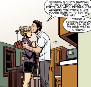 He pulls her close into a hug, kisses her gently on her forehead. He tells her that the department he runs is ramping up, so they’ll be working together a lot more, he thinks. It’s better this way, he agrees. “You’re a terrific person, Buffy. I’m glad to have you as a friend.”