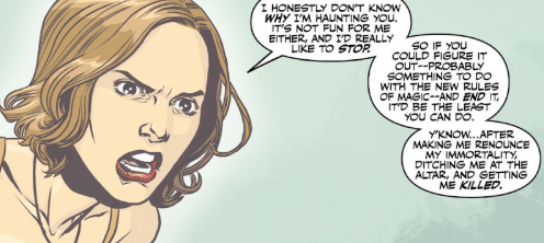 Anya now screams at him, angry. “I honestly don’t know why I’m haunting you. It’s not fun for me either, and I would like it to stop! So, if you figure it out – possibly something to do with the new rules of magic – and end it, it’d be the least you can do.” Another pause. “Y’know, after making me renounce my immortality, ditching me at the altar and getting me killed.”