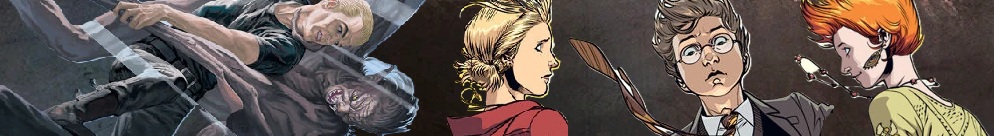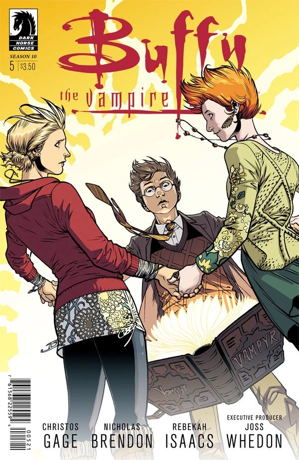 Later, the Vampyr book sits in the middle of the dining room table in Xander and Dawn’s apartment. The group sit around the table, beverages in hand, staring at the book. Buffy is the first to break the silence. “We can’t just, like, put it on a shelf?”