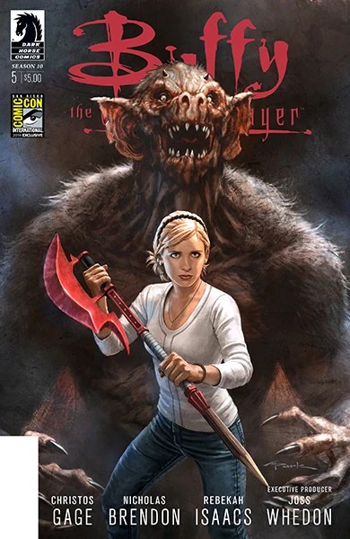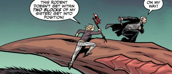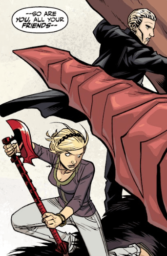 Buffy and Spike, now atop the spire, wait for Maloker to reach Dawn. As the younger Summers starts to panic, Buffy and Spike both leap and, in a feat that Dawn can barely believe, they land directly on Maloker’s raised vampire bumps. Buffy yells down at him, Scythe in hand: “DON’T YOU TOUCH MY SISTER!” and, without waiting, plunges the Scythe straight into the demon’s eye while Spike takes a stake to the other.