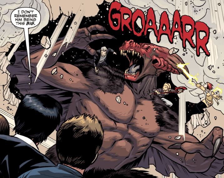 As rubble falls all around them, the hotel crumbling to pieces, Giles conjures up a quick force field before they’re crushed by the debris. “Maloker is an Old One. He is as large as he wishes to be. The Deeper Well was a confined space, I’d imagine he chose an appropriate scale. There are no restrictions here. And as Dracula is still in the process of transforming into Maloker, he will have much less control over his form.”