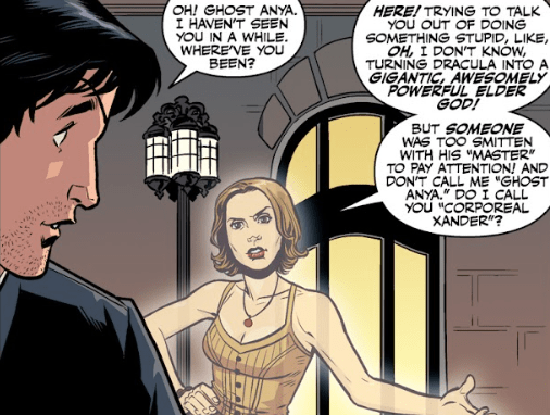 If it’s even possible, Anya gets even louder and more shrill. “Here!” she cries, pointing and gesticulating at the chaos around her. “Trying to talk you out of doing something stupid, like, oh, I don’t know, turning Dracula into a gigantic, awesomely powerful elder God!” But someone was too smitten with his ‘Master’ to pay attention! And don’t call me ‘Ghost Anya.’ Do I call you ‘Corporeal Xander?’”