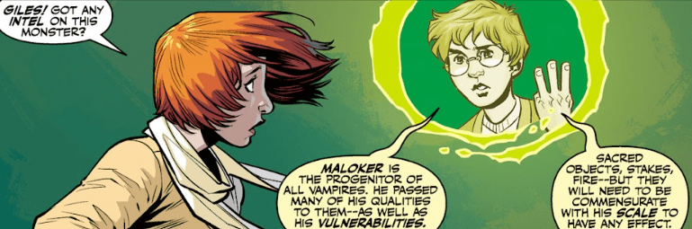 The image of Giles talks quickly, reciting information like a walking, talking encyclopedia. “Maloker is the progenitor of all vampires. He passed many of his qualities to them, as well as his vulnerabilities. Sacred objects, stakes, fire – but they will need to be commensurate with his scale to have any effect.”