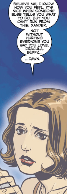 Anya shakes her head. “Believe me, I know how you feel. It’s nice when someone else tells you what to do. But you can’t run from this, Xander. Not without hurting everyone you say you love: Dracula, Buffy… Dawn…”