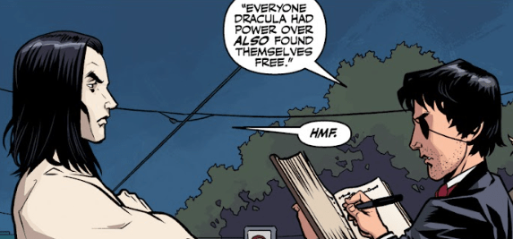 He picks up the quill, surprising Dracula, and starts to read what he’s writing out loud. “”Dracula’s awesome willpower gave him the strength to fight off Maloker, and give up the new powers he’d acquired.””