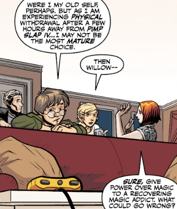 Willow doesn’t even offer a suggestion. She waves her arms in a negative fashion. “Sure, give power over magic to a recovering magic addict. What could go wrong?”