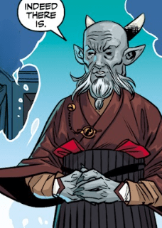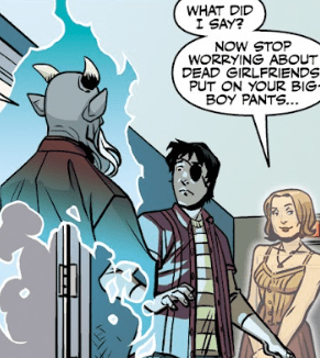 D’Hoffryn hears Xander’s mention of his name and when he glides over to Xander, Anya moves to D’Hoffryn’s side. Xander brings up something relevant to disguise Anya. “Uh, I thought your Illuminati of Magic Big Shots got eaten by Maloker.”