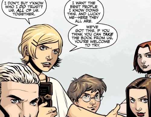He clicks his fingers and his body starts to become transparent. Soon, he’s mist and he glares at Buffy before his head is the last thing to disappear. “A last word of warning: exercise care with that book. It is a singularly dangerous thing. You have an unmatched opportunity to chart the course of the future, or bring untold disaster on us all. And you’ve just seen in which direction the odds are stacked.”