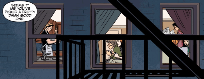Buffy looks over at the apartment, watching her friends through the windows. “You might be right about that.”