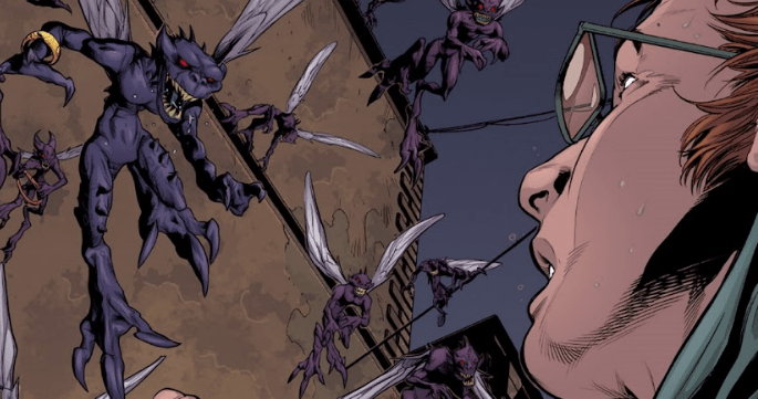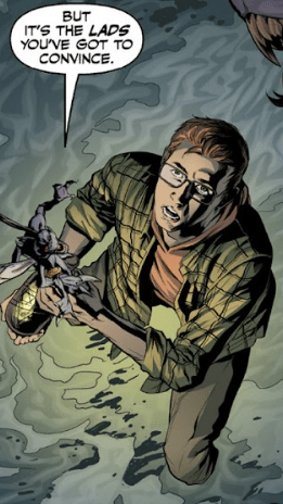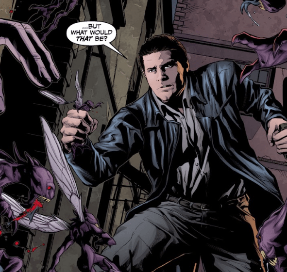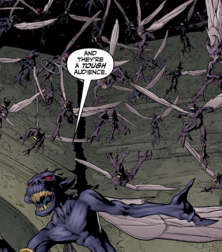 A voice from the shadows stops the pixies in their tracks. Turning, they see Angel emerging from the shadows. He picks up a pixie in his hands, threatening the rest. “I’d say pick on someone you’re own size but what would that be?”