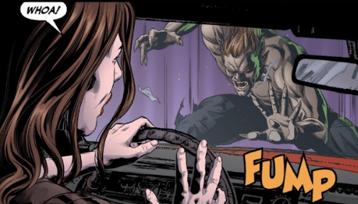 A zompire lands on the car bonnet, taking Kennedy by surprise. She attempts to maintain control of the car, but ends up crashing it into a street light. The zompire jumps away from the wreckage and Faith emerges, unharmed, but pissed.