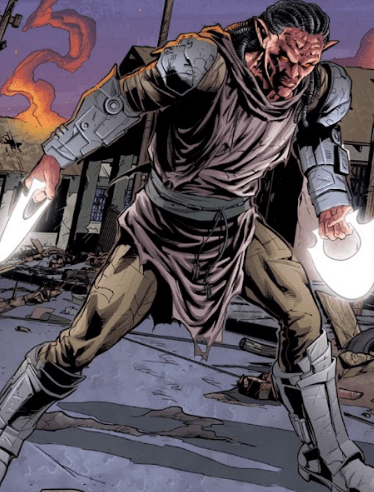 He’s a large demon, with yellow eyes and a thick mane of black hair. The circular blades on his hands appear to be self-generating, the Slayer notes, and his clothing has a tribal sheen to it.