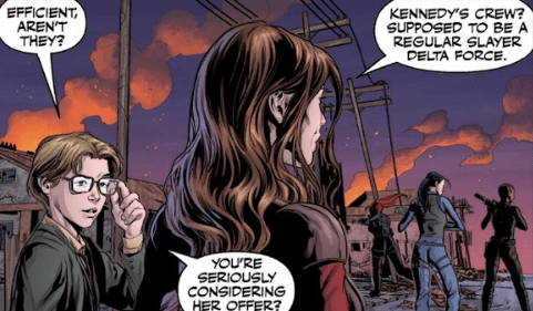 As Kennedy and her team head towards the centre of town, Rupert Giles, also emerging from the back of the wrecked car, adjusts his glasses and turns to his former charge. “Efficient, aren’t they?” He nods after Kennedy.