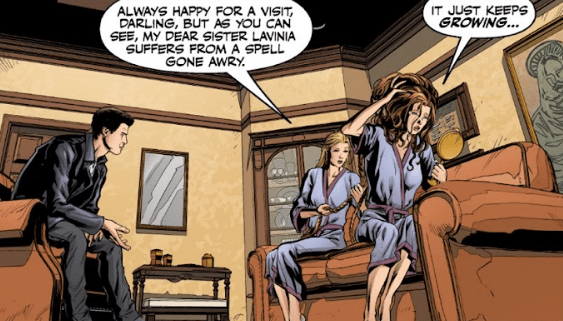“Always happy for a visit, darling. But as you can see, my dear sister Lavinia suffers from a spell gone awry.”