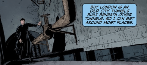 Later, after leaving the Fairweather Sisters, Angel uses the cavernous Victorian sewers under London to navigate the streets. He likes it: it reminds him of old times. And better than that, he has time to think.