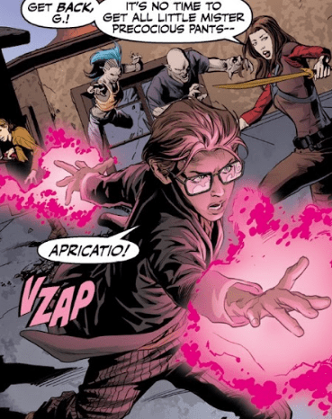 But Faith can see now that the young Rupert Giles has already mastered several of his spells now that he’s attuned to his magical destiny. He yells a spell that gets attention from the others. “Apricato!”