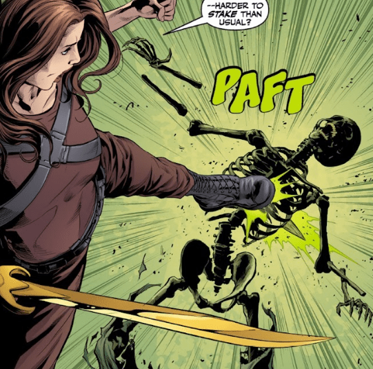 “Boys. I can’t say I’m impressed with your valet skills. Now come here, and get staked, you ugly…” The zompires aren’t in front of her, but Faith can hear them, skittering in shadows. Suddenly she sees two sparks of light, both from circular blades. The zompires fall forward, their heads removed, and instantly evaporate into dust. Faith does not recognise her saviour.