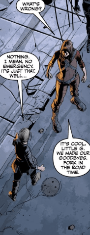 Faith sees that he’s having a rough time for a moment, and instinctively crouches down to his level. “It’s cool, Little G. We made our goodbyes. Fork in the road time.”