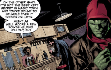 As Angel approaches the bar, a green-skinned demon on the other end of it watches Angel’s exchange closely. He has a red cloak with a hood that disguises most of his features, and, when he notices Angel looking at him, he seems kind of nervous.