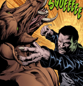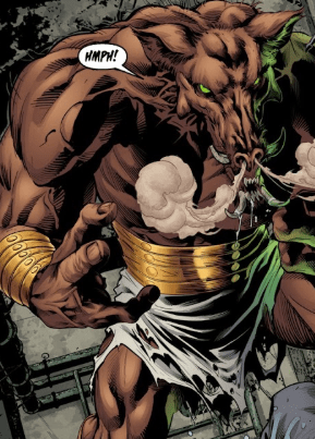 In front of him is Corky, floating above a Minotaur-like creature. Corky’s Irish brogue is starting to grate on Angel’s nerves.