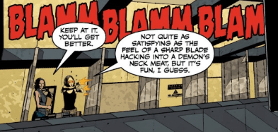 Faith shakes her head. “Not quite as satisfying as the feel of a sharp blade hacking into a demon’s neck meat, but it’s fun I guess.”
