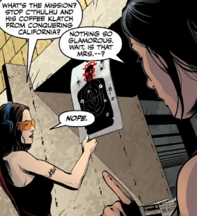 Faith ruffles her hair and pulls the lever for the target. Kennedy places the file down on a bench. “What’s the mission? Stop Cthulhu and his coffee klatch from conquering California?”