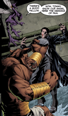His words are interrupted as, suddenly, Angel’s hands come up behind his head and grabs Tommy by his fingers. Without getting up, Angel snaps the fingers, causing Tommy to roar in agony and let his grip on the vampire go.