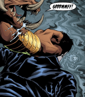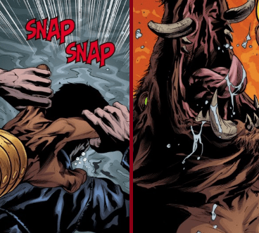The blow to his face doesn’t help either. The bull-man must get bored easily, because the next thing Angel knows, he’s in the air, flying as the bull tosses him like a baseball.
