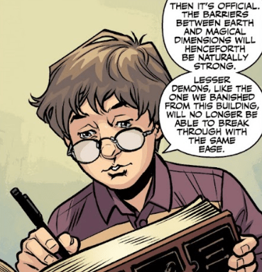 Giles steps forward, glasses already halfway down his nose. “Then it’s official,” he says. “The barriers between Earth and the magical dimensions will henceforth be naturally strong. Lesser demons, like the one we banished from this building, will no longer be able to break through with the same ease.”