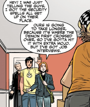 Willow bursts into the apartment, arms full of folders and a faint shimmer of residual spell craft clinging to her coat. “Hey!” she says, breathless. “I was just telling the guys…I got the security spells all set up on their place. Ours is going to take longer, since it’s where the demon first crossed over. Gotta hit it with extra mojo. But I’ve got job interviews.”
