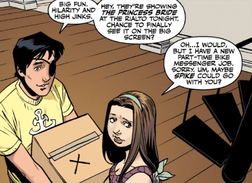 Dawn hesitates, shifting the box in her arms. “Oh, I would, but I’ve got a new part-time job. Bike messenger gig. Sorry. Um… maybe Spike could go with you?”