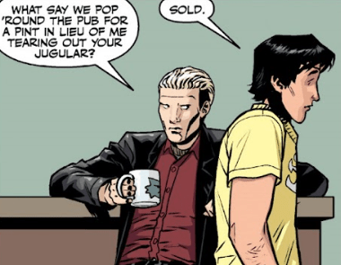 Spike snorts. “Oh, piss off, Harris. That’s the sort of thing the old, soulless me would’ve done. I’m no bloody saint, but I ain’t that bloody selfish.” He sets the book down, more gently than expected. “Anyway, I’m over her. We’re friends. Got a mutually respectful relationship of mature equals and it’s all very mature.”
