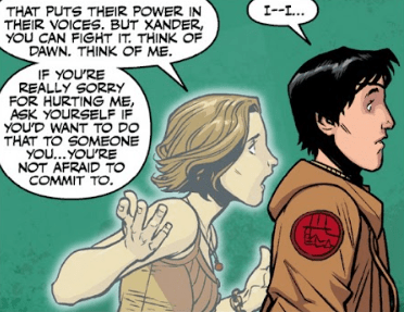 Buffy leans in, whispering just loud enough for Xander to hear. “You’re doing great. Be patient. Give her space. And dial back just a scooch on the trying. I’m walking her to work. Gonna talk you up the whole time. Don’t worry. You got a Slayer for your wingman.”