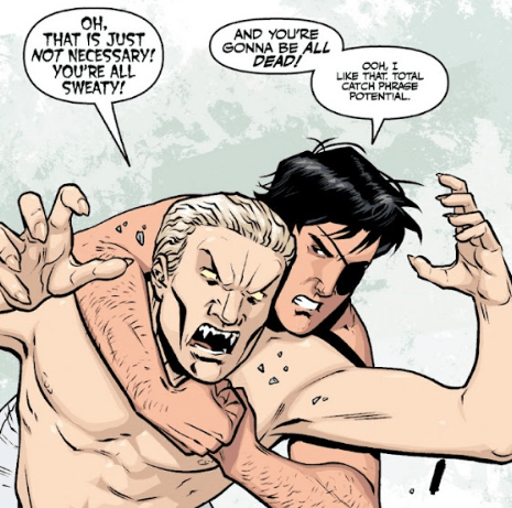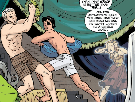 Xander, still inexplicably on Spike’s back, mutters, “We will never speak of this again.”