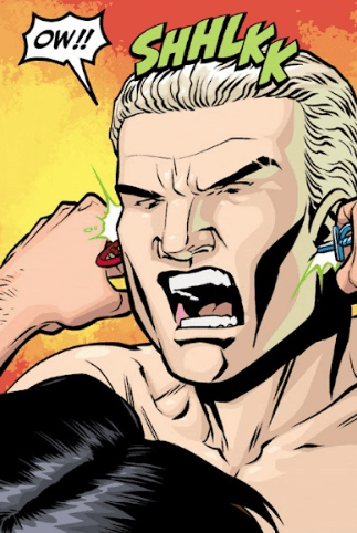 He smashes a glass bottle against Spike’s back. Spike winces. “Ow! You’re a hard man to ignore, Harris!”